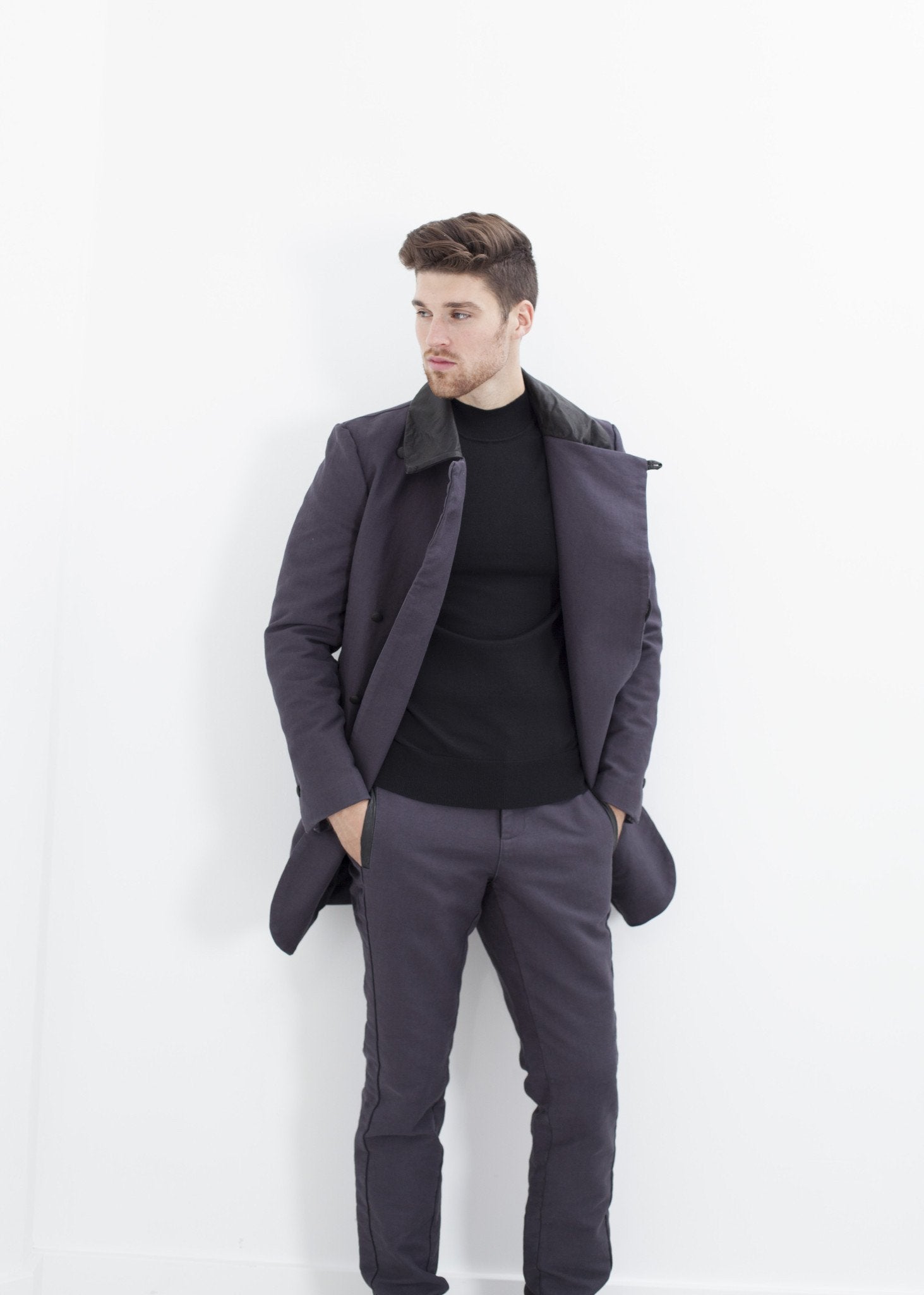 Leather details signature these flat front cotton pants by Hannes Roether. Featuring leather welted pockets at side seams and back as well as leather covered buttons. A back yoke completes the pants. Color Phantom. Outer 100% Cotton, Lining 50% Cotton & 50% Polyester. Spencer is wearing a size Large.